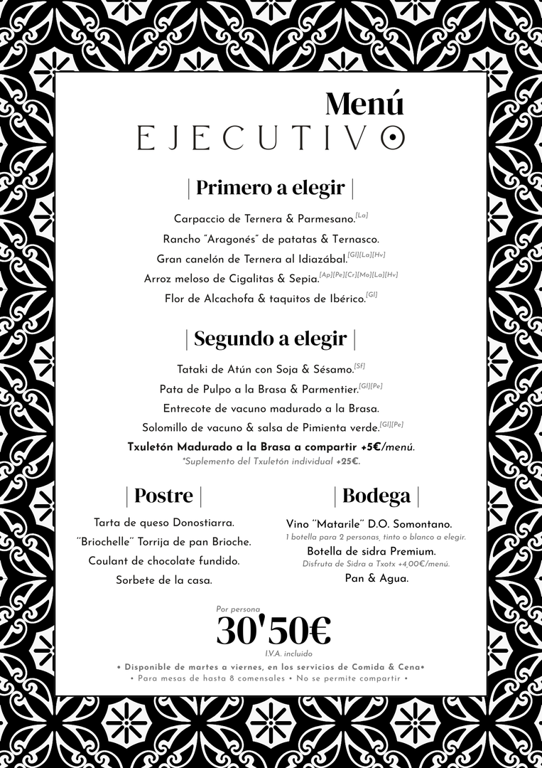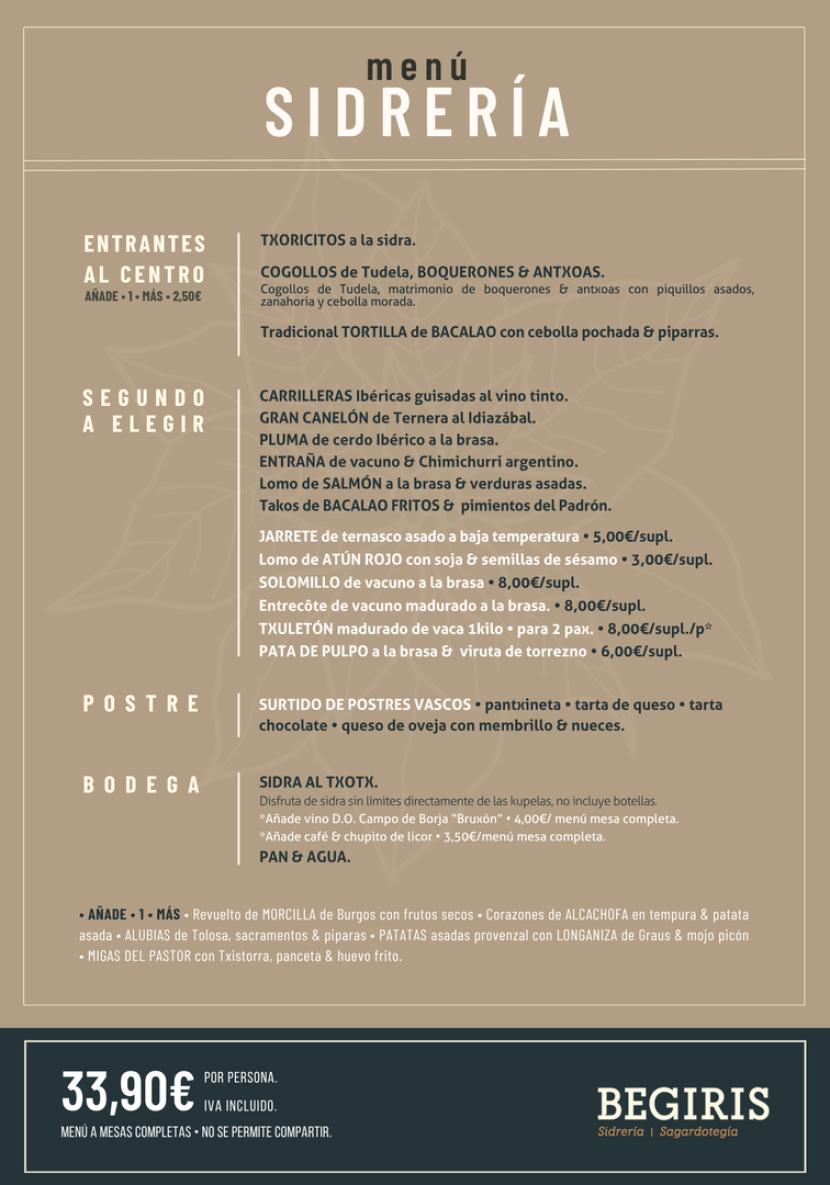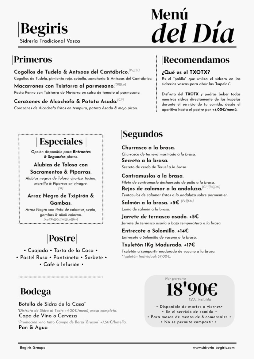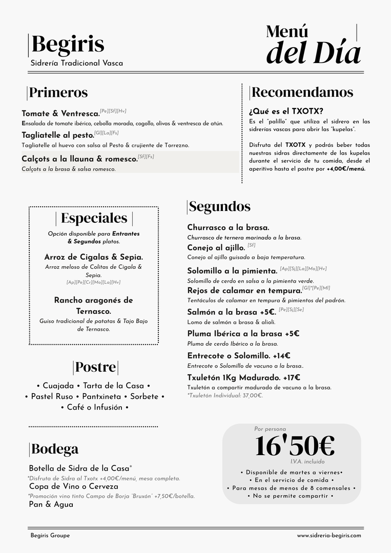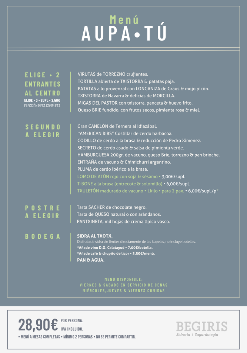 Esta es la variedad de menús que podrá disfrutar en sidrería Begiris de MARTES a VIERNES en el servicio de comida 13:00H a 18:00H (EXCEPTO FESTIVOS).