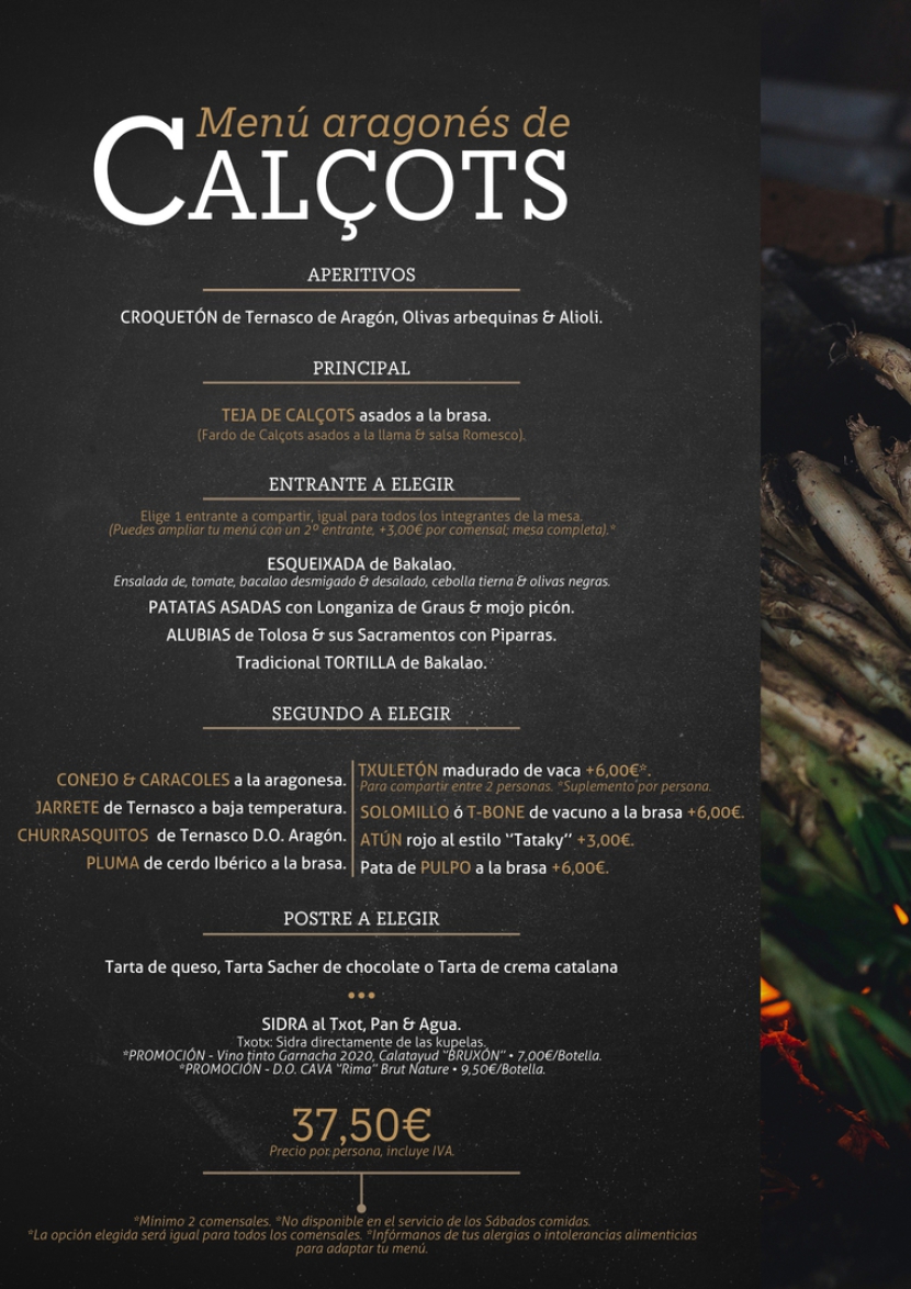 Desde finales de ENERO hasta finales de ABRIL podréis disfrutar de un menú con aires catalanes donde poder distrutar como no de una teja de Calçots acampañada de tu elección a la brasa & sidra al TXOTX.
